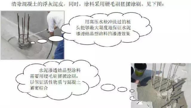 1、桩头防水处理的关键是桩头的清理工序,采用高压水枪冲洗桩顶面混凝土能够有效清除混凝土的浮灰泥皮。同时,涂料采用硬毛刷搓揉涂刷。见下图: